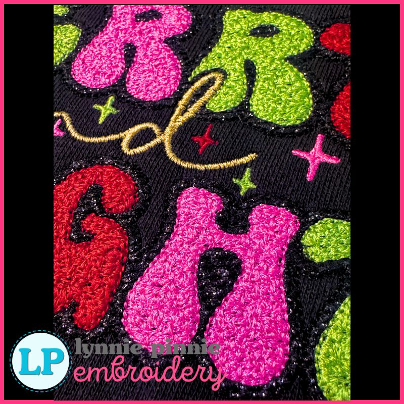 Create a bold and colorful holiday statement with this Faux Chenille Merry and Bright design, featuring our signature, show-stopping LP faux chenille look. This technique is stitched directly on top of heat transfer vinyl (HTV), allowing you to achieve a dimensional, fluffy chenille effect with zero trimming required—just stitch, tear away the excess HTV, and enjoy.